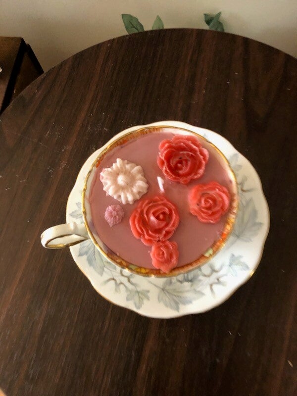 Each unique, homemade candle is housed in a repurposed teacup, making it the perfect piece of reusable decor once the wax is gone.