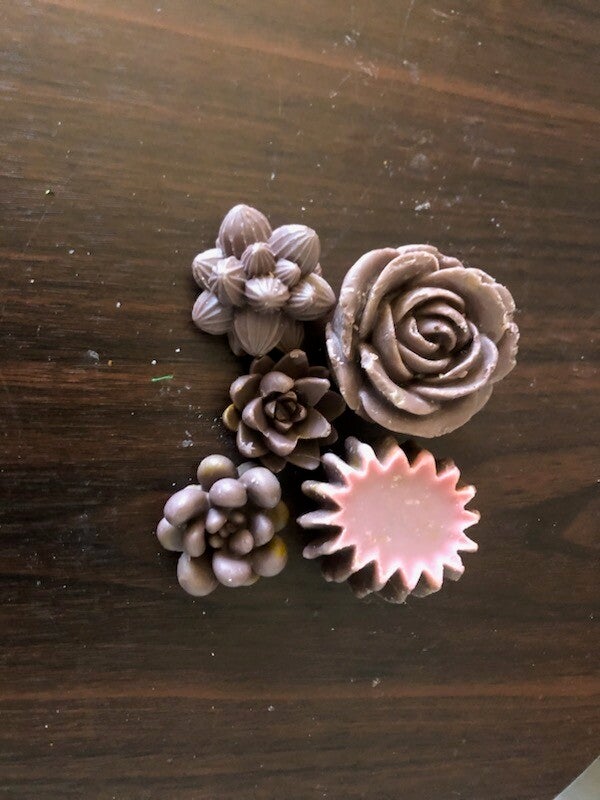 A stunning arrangement of five handcrafted soaps, each molded into intricate botanical shapes like blooming roses, succulents, and geometric petals. The soft, dusty-rose and mauve tones offer a timeless, feminine appeal.