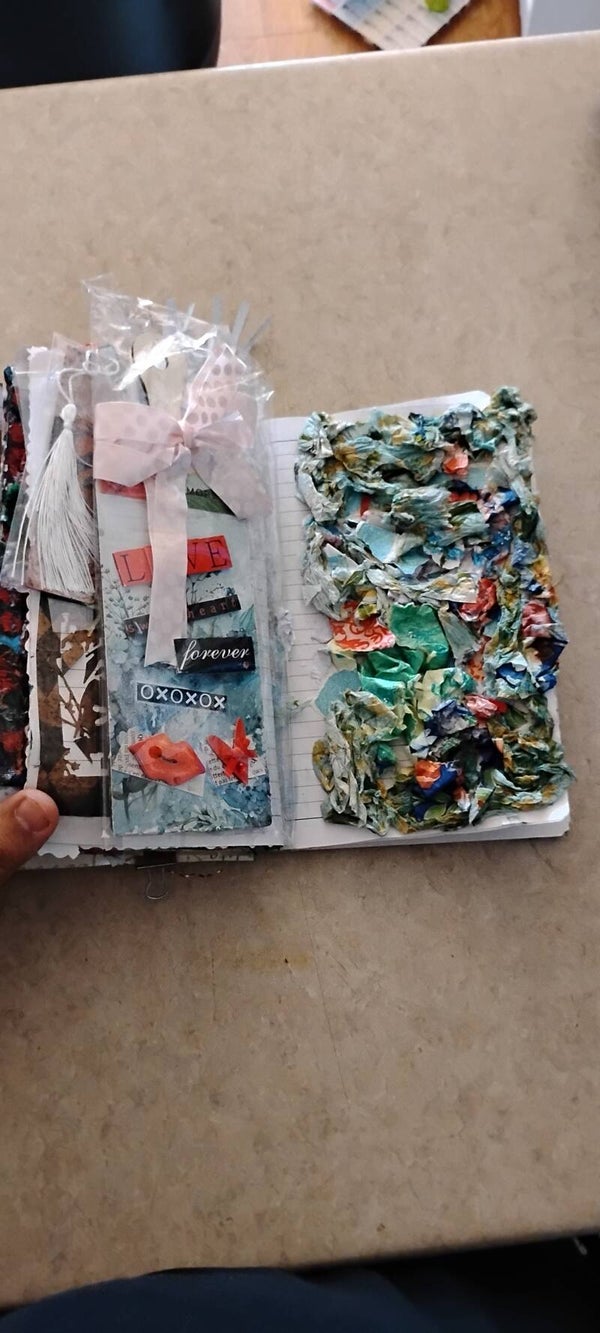 Layers of handmade papers, envelopes, and mixed-media designs—featuring beautiful textures, including art created with unconventional materials that bring a tactile, gallery-like feel.